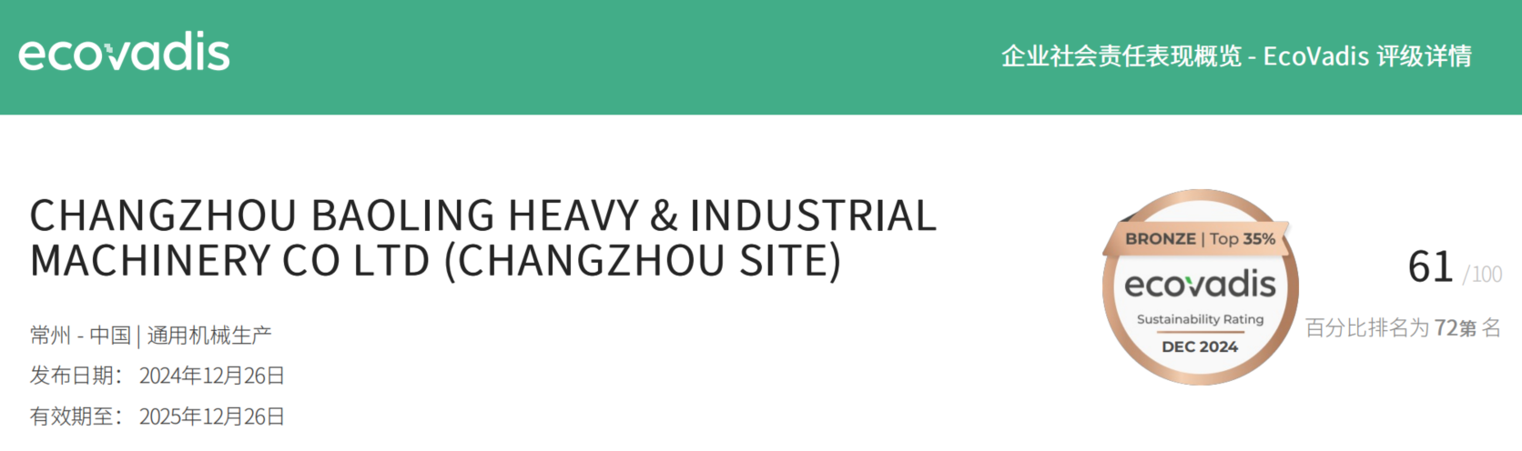 2024年12月26日,寶菱重工在EcoVadis企業(yè)社會(huì)責(zé)任評(píng)估中得分61分,并榮獲“銅牌”,在EcoVadis所有在評(píng)公司中躋身于前 35%(已超過(guò) 65% 以上的公司)。當(dāng)前,“環(huán)境、社會(huì)責(zé)任和公司治理”(簡(jiǎn)稱(chēng):ESG)水平已成為衡量企業(yè)長(zhǎng)期價(jià)值和可持續(xù)發(fā)展能力的關(guān)鍵因素,其核心在于“友好環(huán)境、尊重員工、合規(guī)經(jīng)營(yíng)、可持續(xù)發(fā)展”。公司將可持續(xù)發(fā)展理念融入企業(yè)戰(zhàn)略與日程經(jīng)營(yíng)活動(dòng)中,推動(dòng)導(dǎo)入ESG